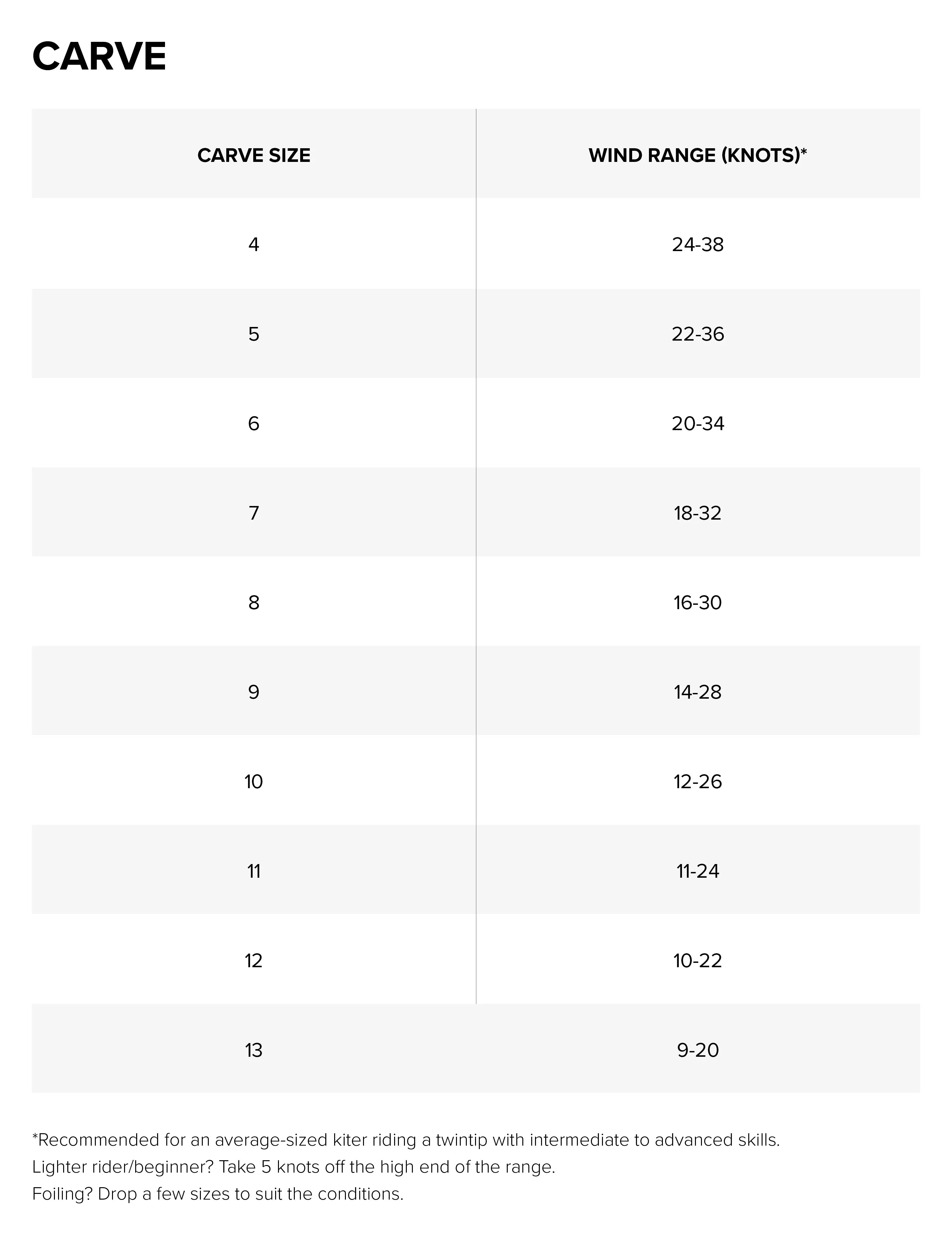 The Carve flies fast upwind and experienced riders will benefit from the kite's impressive power and efficiency. Intermediate riders will find it offers a smoother, more user-friendly ride. Freeride and Strapless Freestylers will love the light reactive steering, longer bar stroke, improved hangtime and catch for rotations and softer landings.